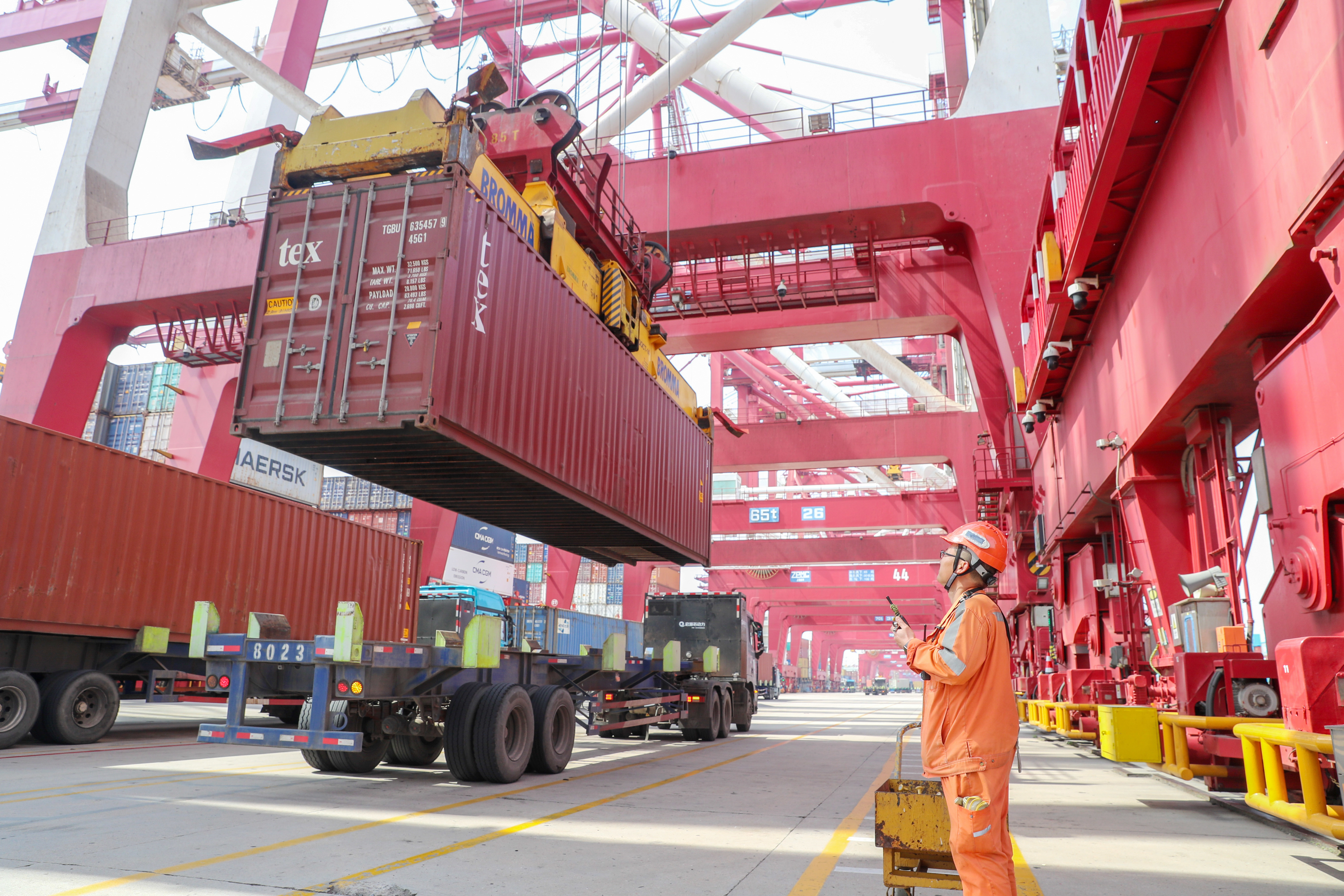 4月26日,工人在山东港口青岛港前湾集装箱码头作业。